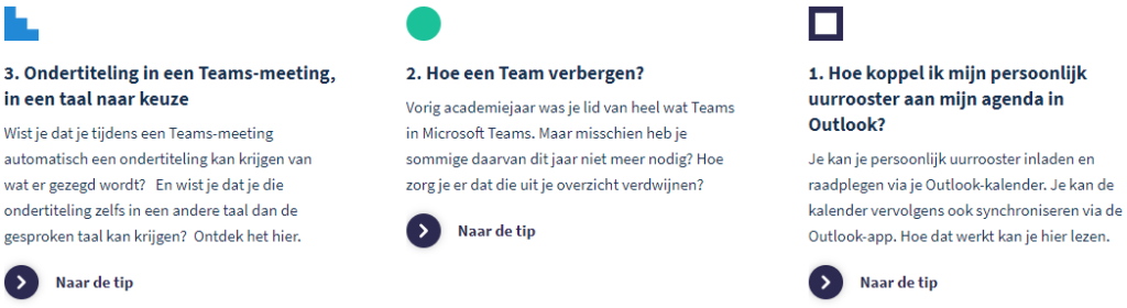 Regelmatig worden er ICTO-studententips verzonden naar de studenten. Deze kan je onder andere raadplegen via de pagina ICT in Odisee op het studentenplatform. Je kan de ICTO-studententips ook snel terugvinden via de zoekfunctie op het platform.
